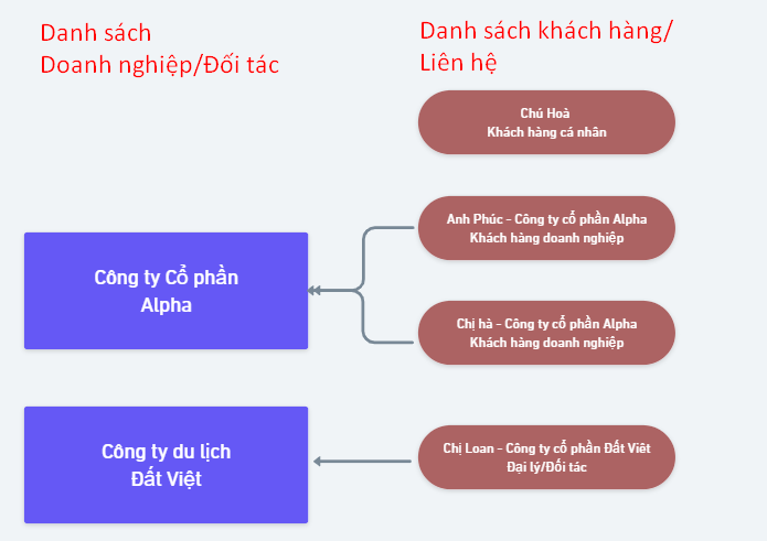 Để dễ hình dung, bạn xem bảng bên dưới để hiểu cách tổ chức và mối liên quan giữa Khách hàng/Liên hệ và Doanh nghiệp/đối tác