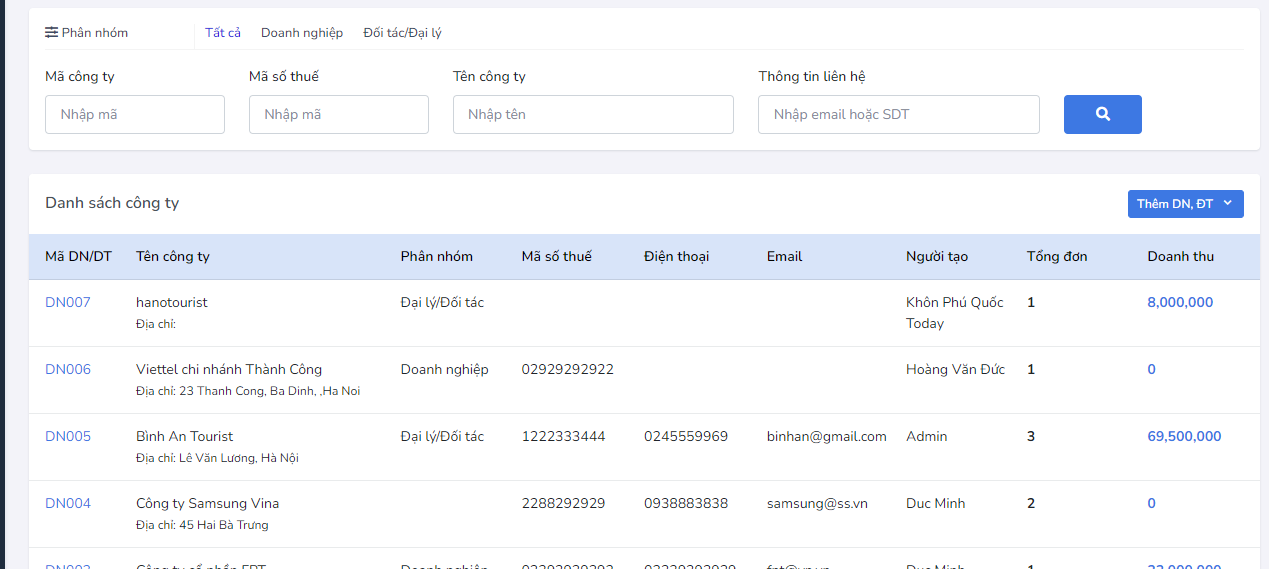 ### 2. Danh sách doanh nghiệp, đối tác (đại lý)